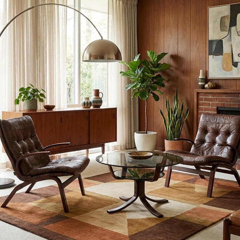 If you're looking for mid-century style , Nordic decor , or spaces with a retro touch, here you can explore different combinations of textures, materials, and colors: fine woods, original upholstery, aged metal, glass, natural fibers, and other elements characteristic of modern design from the 50s, 60s, and 70s.