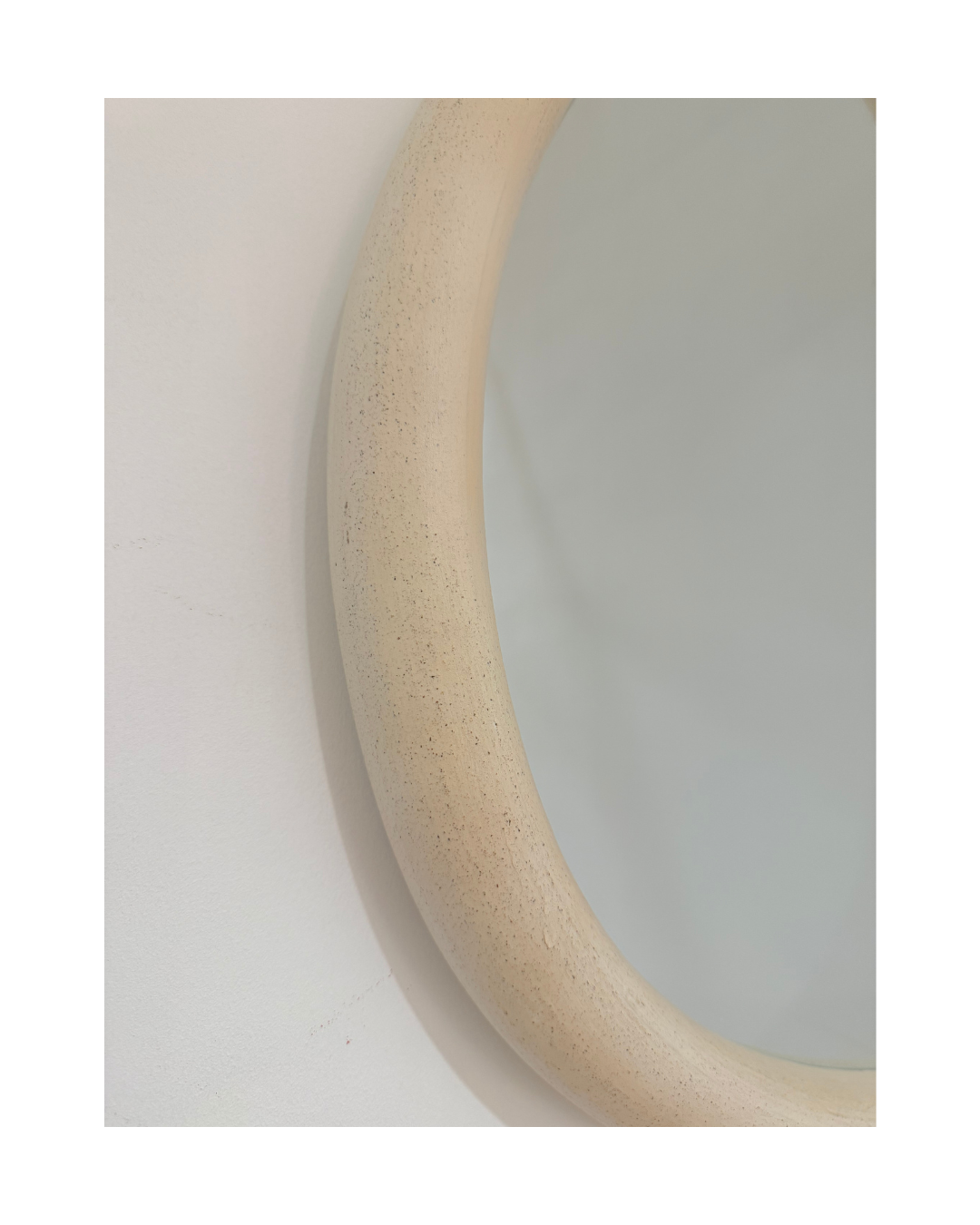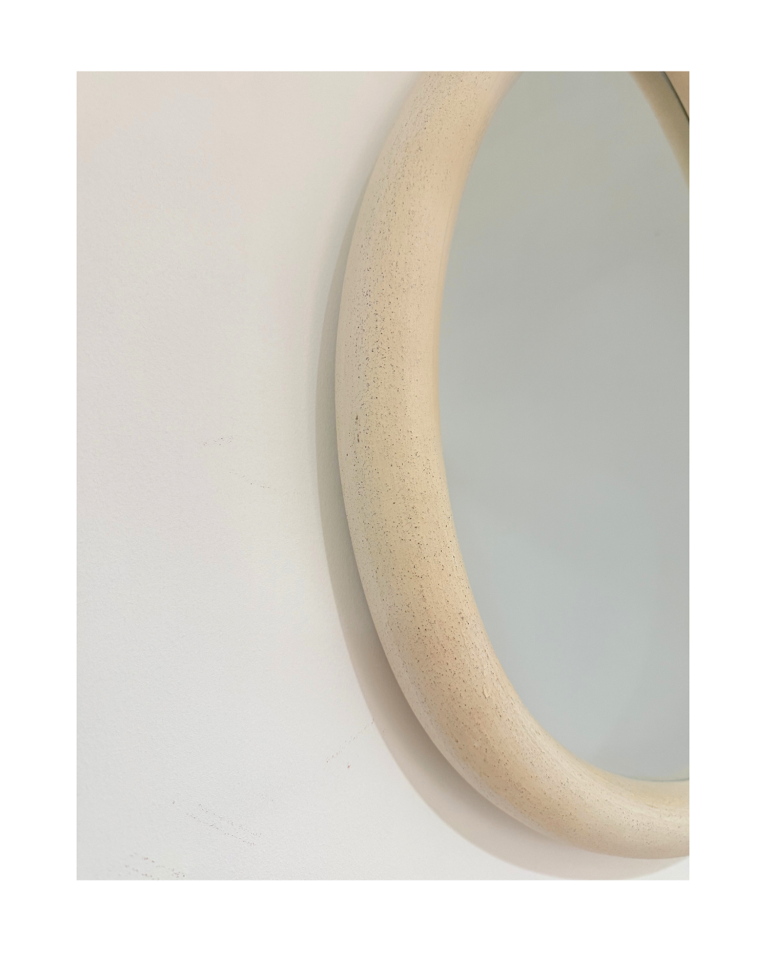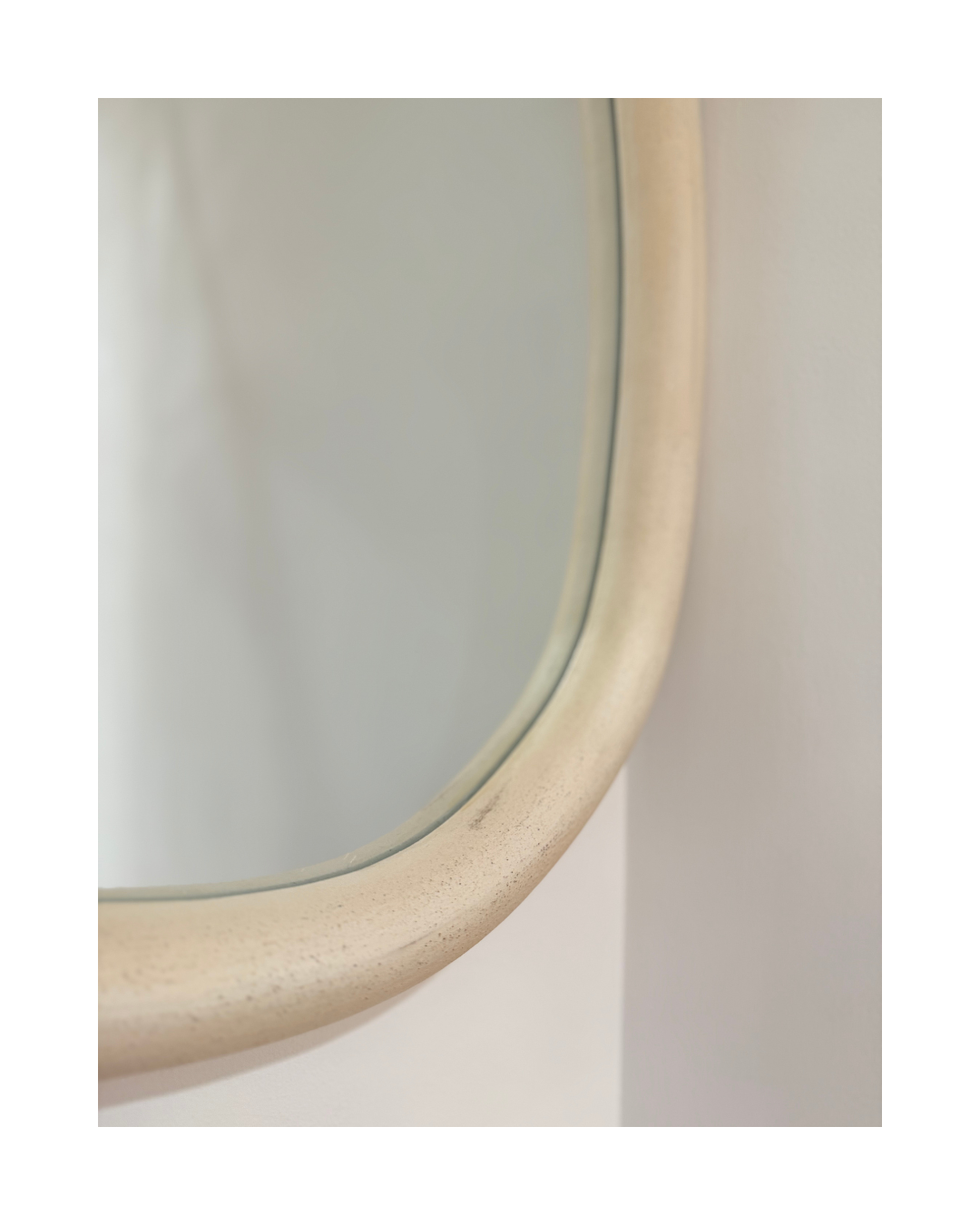 This decorative mirror, with its irregular and organic shape and soft beige lacquered MDF frame, is ideal for adding warmth, harmony, and contemporary style to any space. Its fluid and asymmetrical silhouette breaks with traditional geometric rigidity, making it a perfect sculptural piece for minimalist, Nordic, or wabi-sabi interiors.