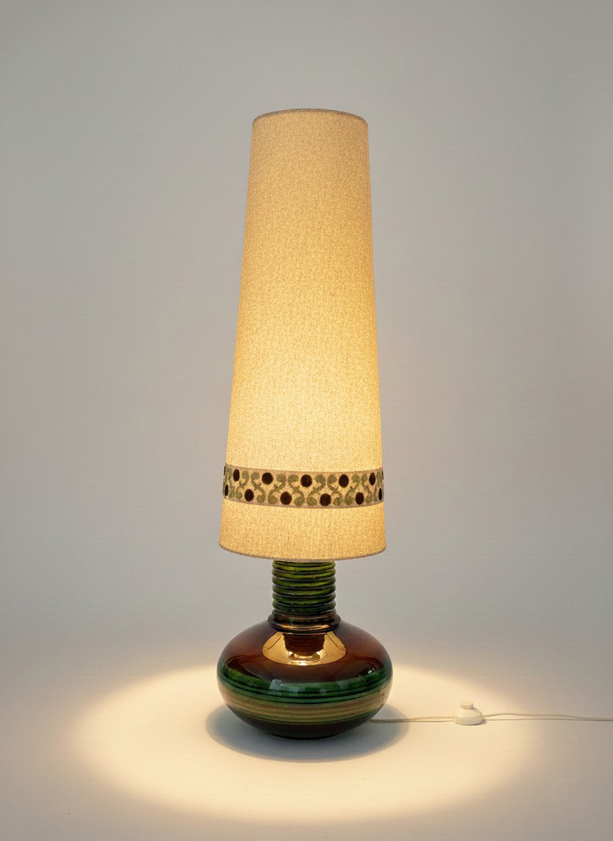 This elegant vintage table lamp combines a glazed ceramic base in deep brown and bottle green tones with a textured, conical shade, creating an iconic piece of 1960s-70s European design. Its elongated silhouette, handcrafted finish, and the warm character of the materials make it a perfect decorative element for mid-century, retro, rustic chic, or contemporary spaces seeking a distinctive touch.