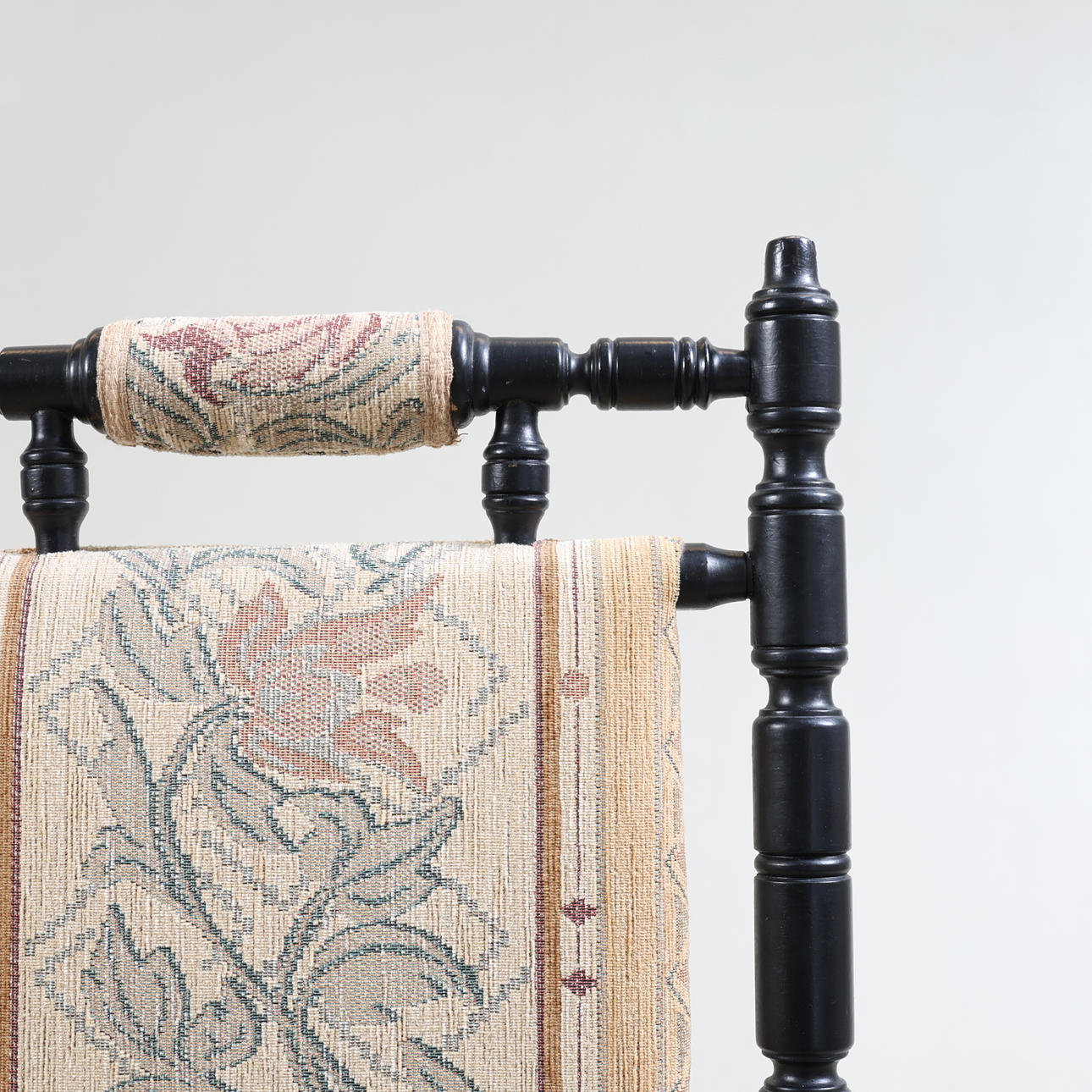 Add a touch of history and comfort to your home with this authentic 20th-century American rocking chair . A piece that combines the sturdiness of classic woodworking with the delicate design conceived for absolute relaxation. Its dark-finished, turned wood frame (ebonized style) contrasts elegantly with upholstery in warm beige tones and soft floral motifs, evoking the charm of American farmhouse or colonial style.