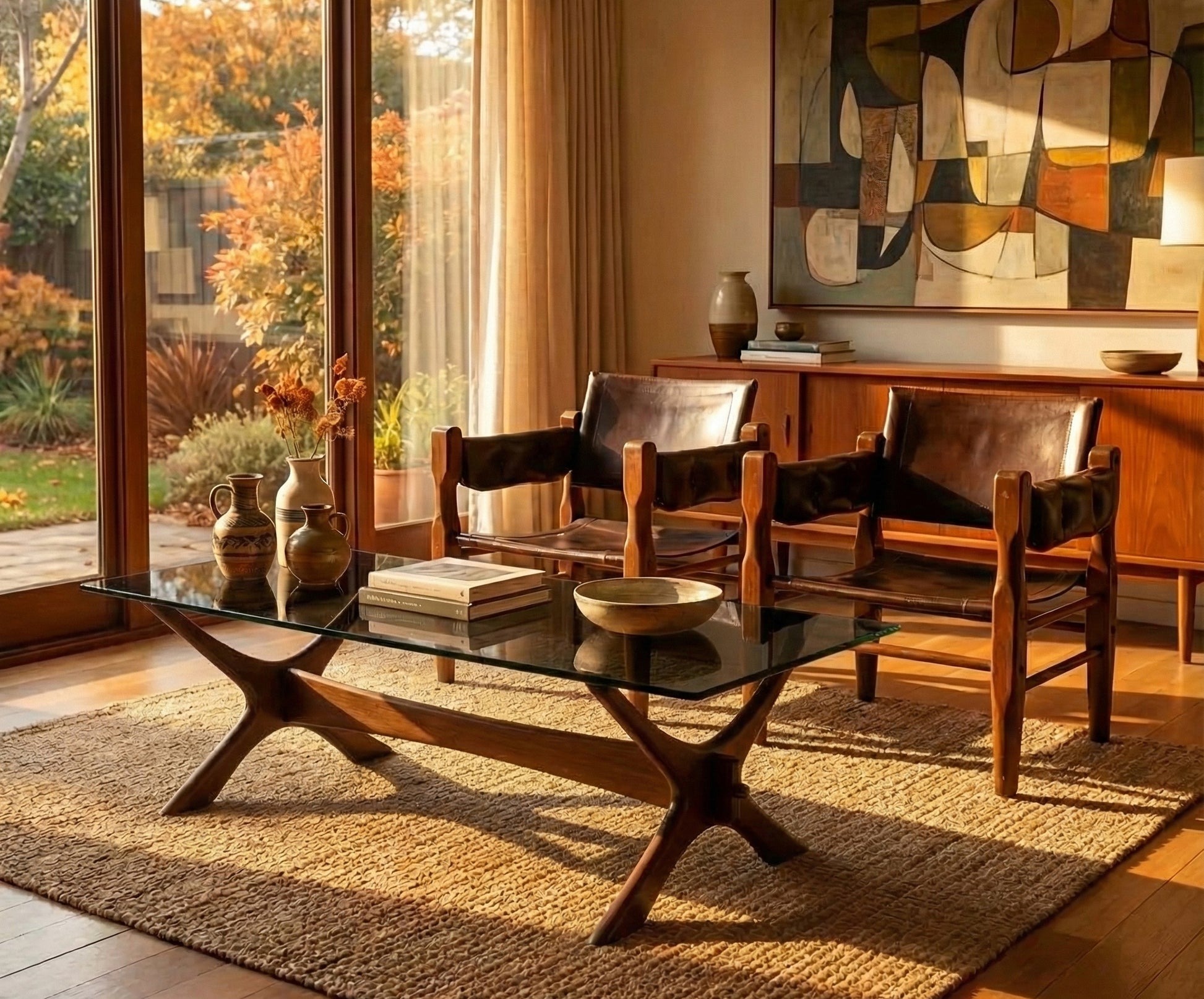 La estructura está elaborada en madera maciza moldeada, con una base orgánica en forma de X que aporta estabilidad y dinamismo visual. El sobre es de cristal ahumado de gran formato, ligeramente biselado, que permite apreciar la arquitectura de la base desde distintos ángulos.