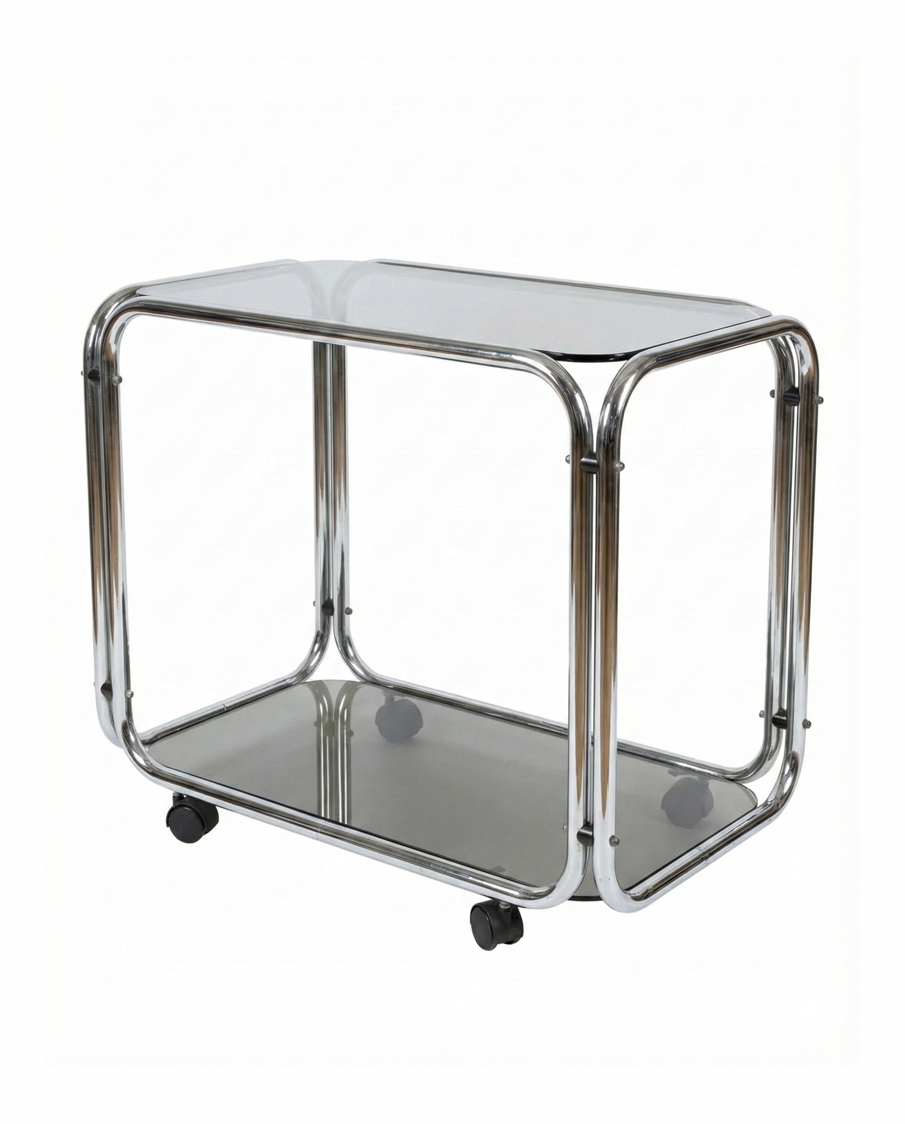 Side table/serving table from the 1960s-70s. Two-tier chromed tubular frame with smoked tempered glass top in the Morex style. Features swivel casters for easy movement.