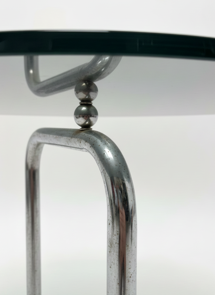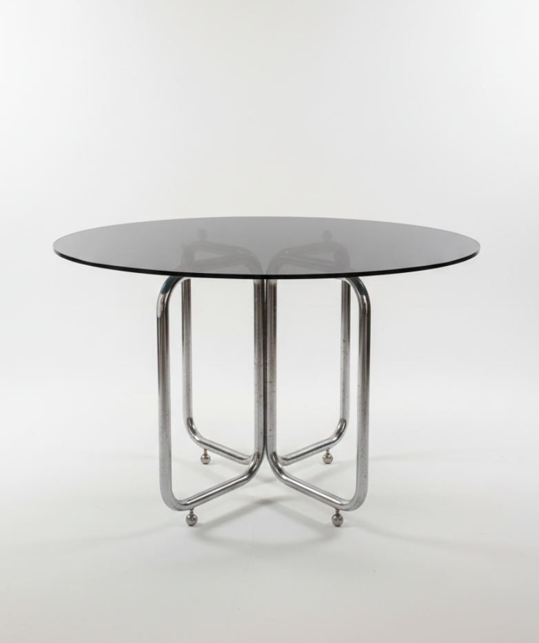 These types of dining tables with a chromed steel tube base and a glass top (often smoked or "fumé") were very popular in mid-century Italian design, especially during the 1970s . Italian design of that era dominated the modern and futuristic style (often called Space Age or Age Space ), using chrome as the main material.