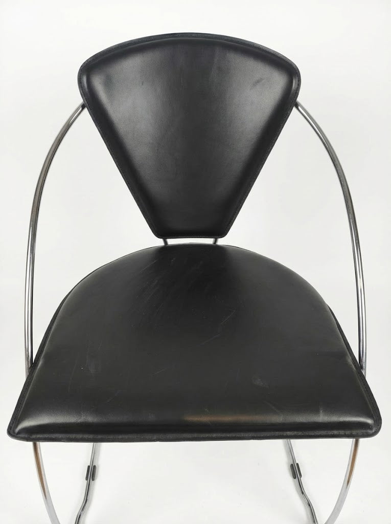 This set of two chairs stands out for its impressive continuous tubular steel frame, which creates a striking, avant-garde silhouette. A perfect combination of the elegant coolness of chrome and the understated elegance of black faux leather upholstery. Ideal for adding character to a modern dining room, a creative office, or a waiting room with personality.