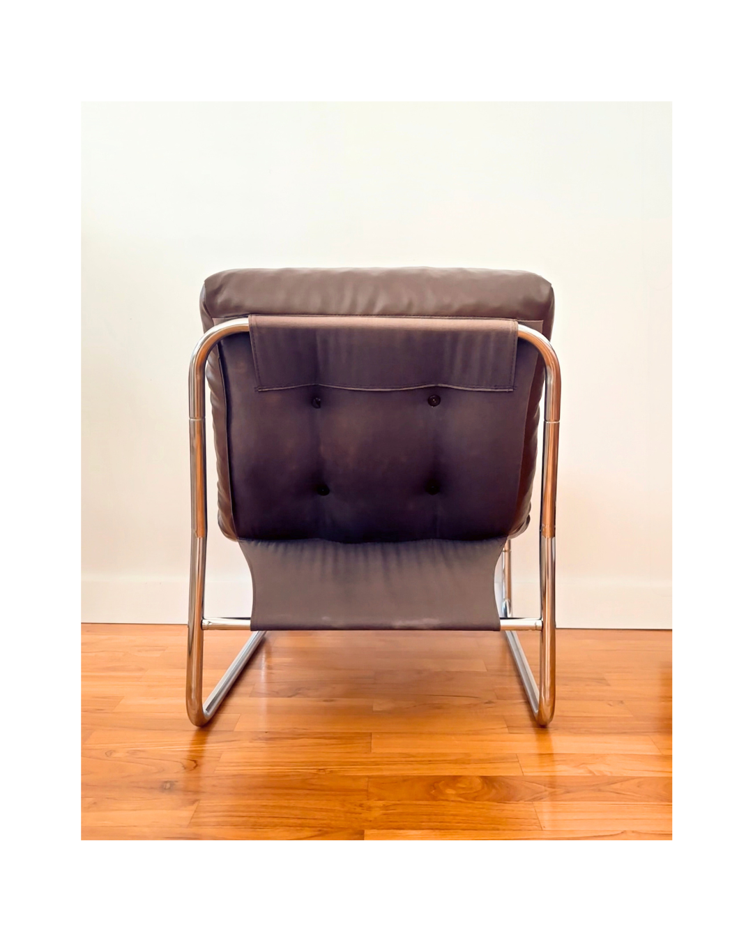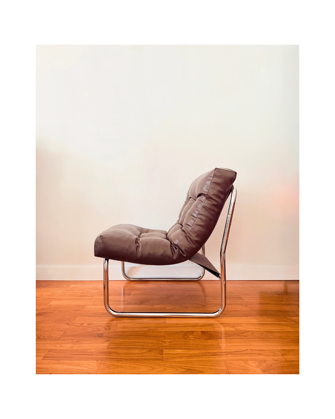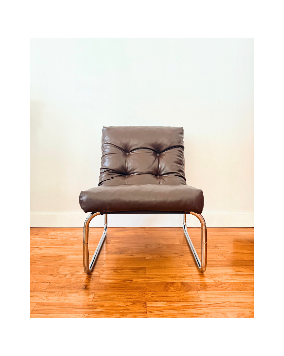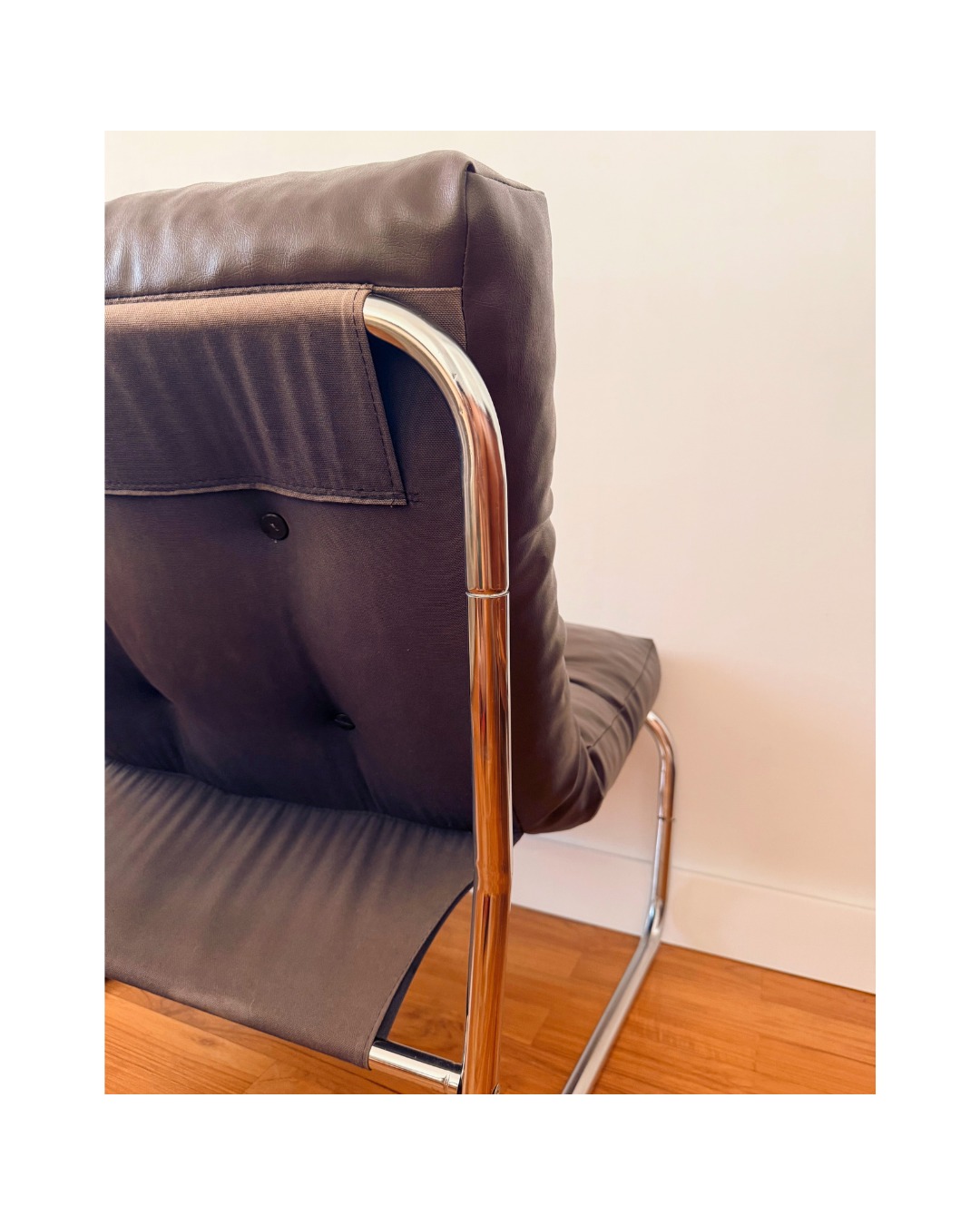 Estado: Excelente. Restaurada y retapizada en piel sintética marrón oscuro, con el cromado en perfectas condiciones.