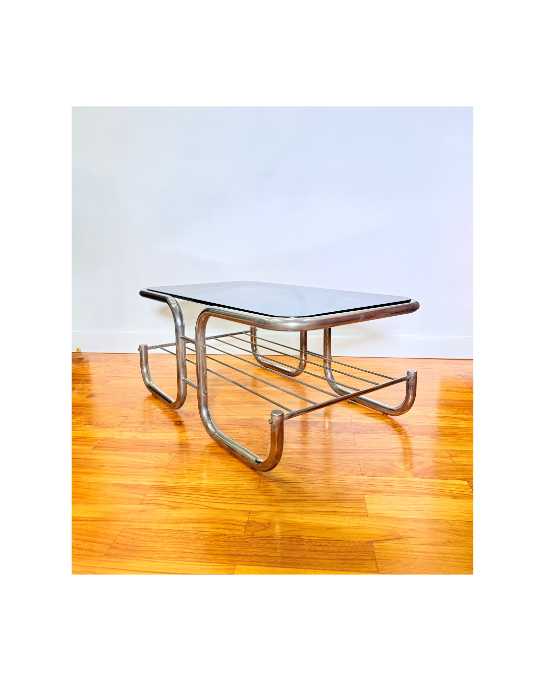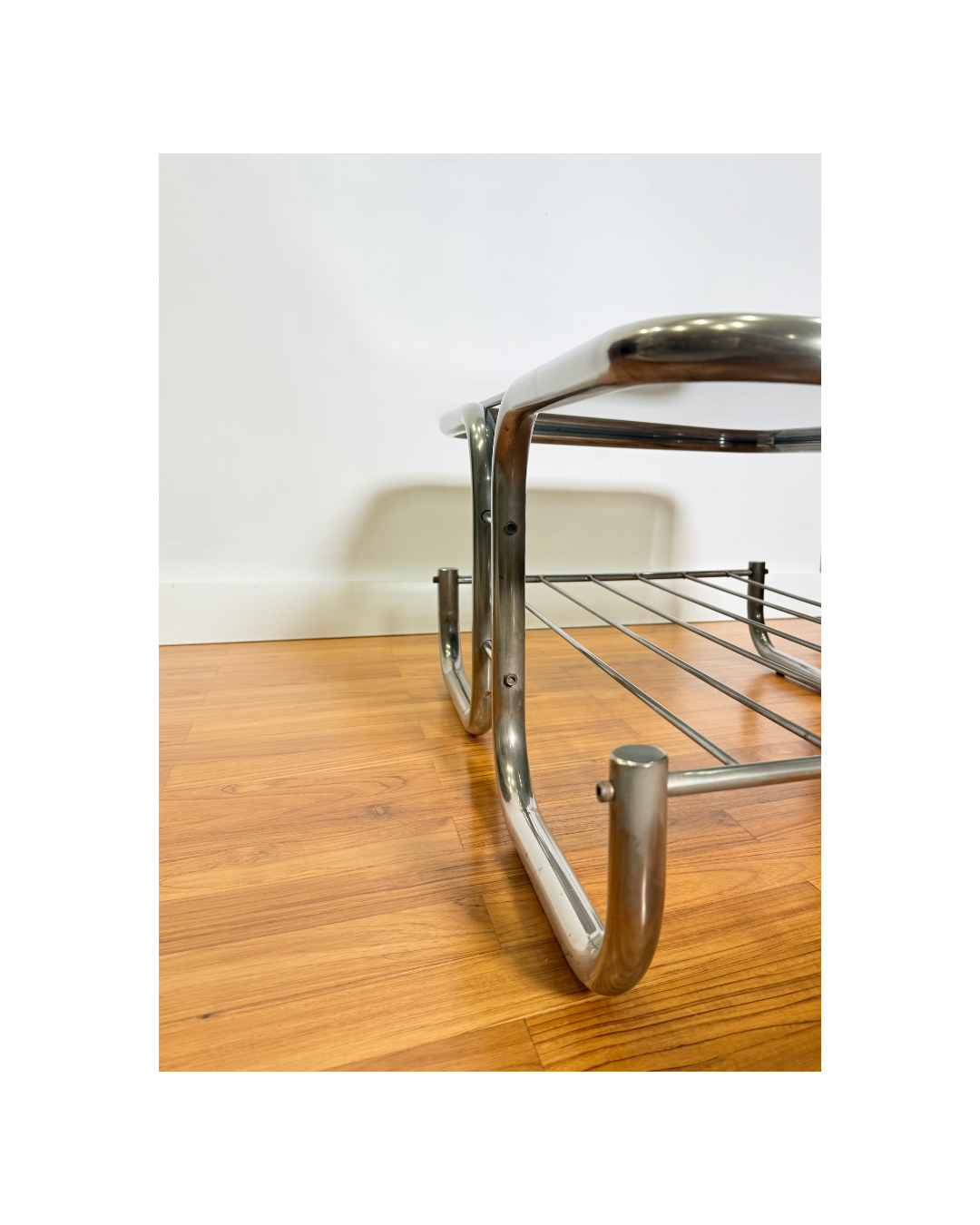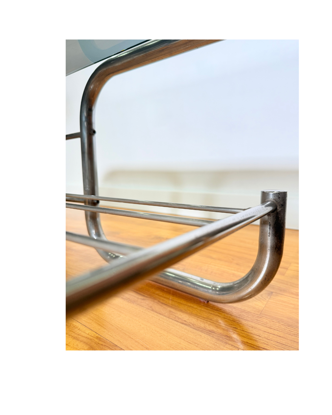 Esta mesa de centro es una auténtica joya del diseño vintage de inspiración Bauhaus. Con una estructura tubular cromada curvada y sobre de cristal transparente, combina elegancia atemporal y funcionalidad. Su doble nivel ofrece un espacio adicional ideal para libros, revistas o decoración, manteniendo una estética ligera y sofisticada.