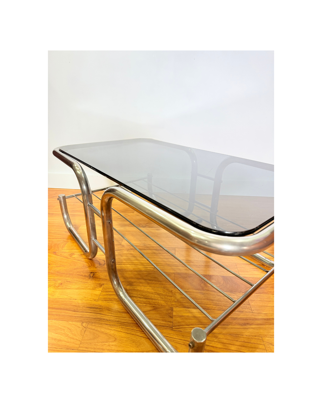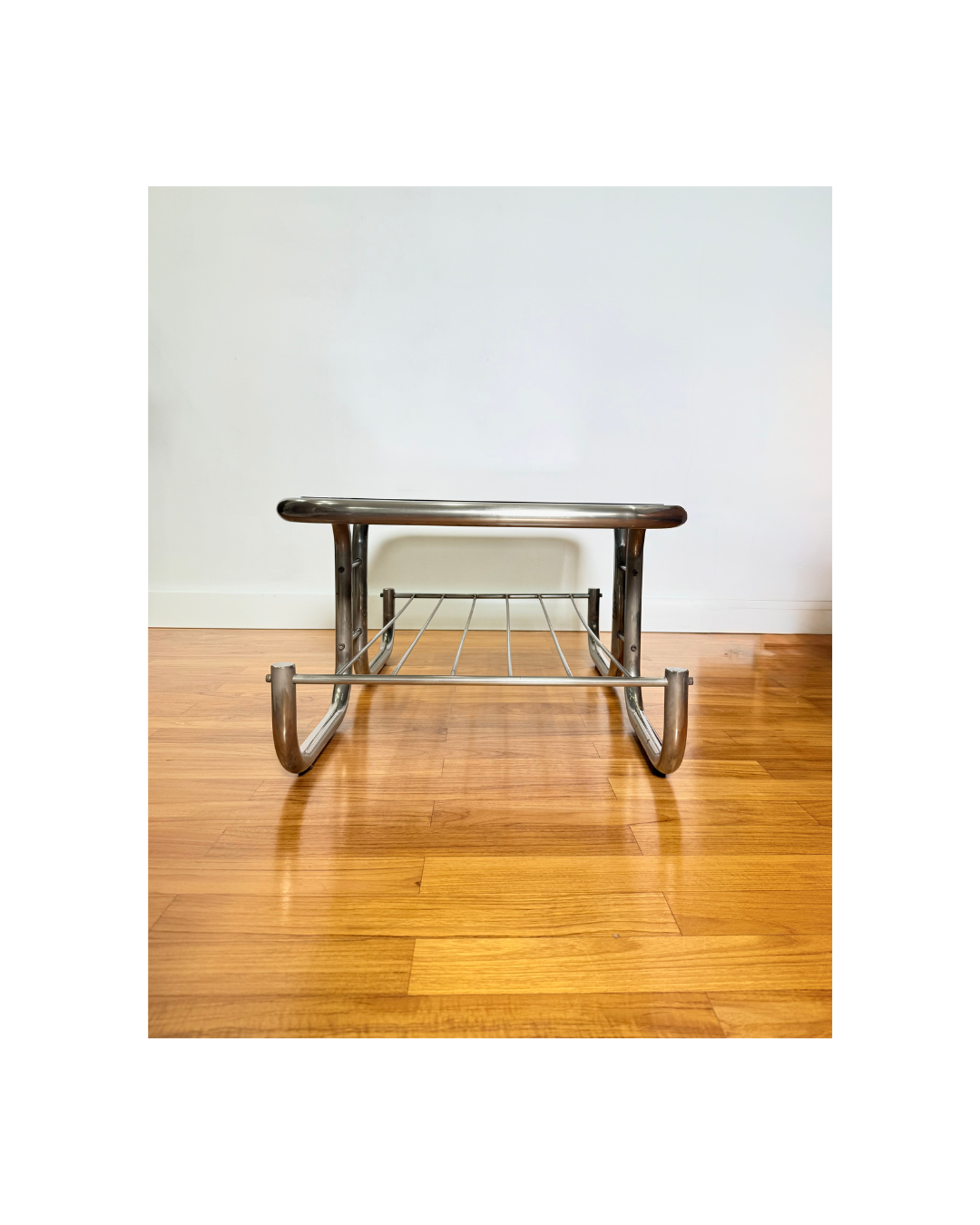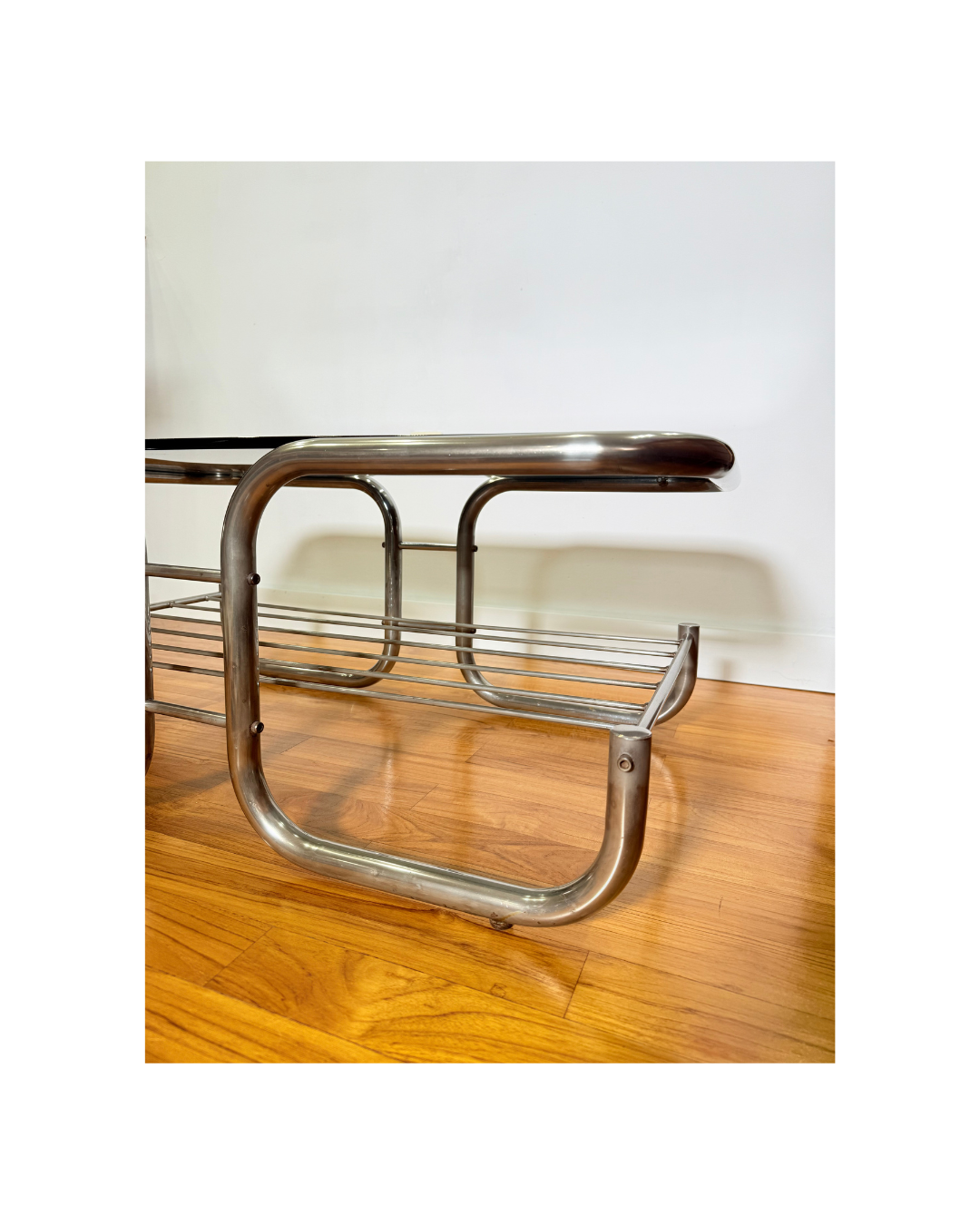 Esta mesa de centro es una auténtica joya del diseño vintage de inspiración Bauhaus. Con una estructura tubular cromada curvada y sobre de cristal transparente, combina elegancia atemporal y funcionalidad. Su doble nivel ofrece un espacio adicional ideal para libros, revistas o decoración, manteniendo una estética ligera y sofisticada.