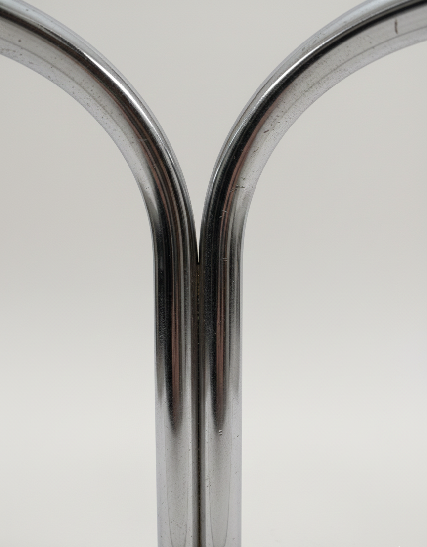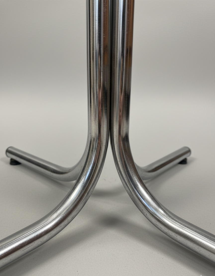 Mesa de comedor redonda con cristal transparente y estructura tubular cromada. Se encuentra en muy buenas condiciones, con alguna marca por el paso del tiempo.