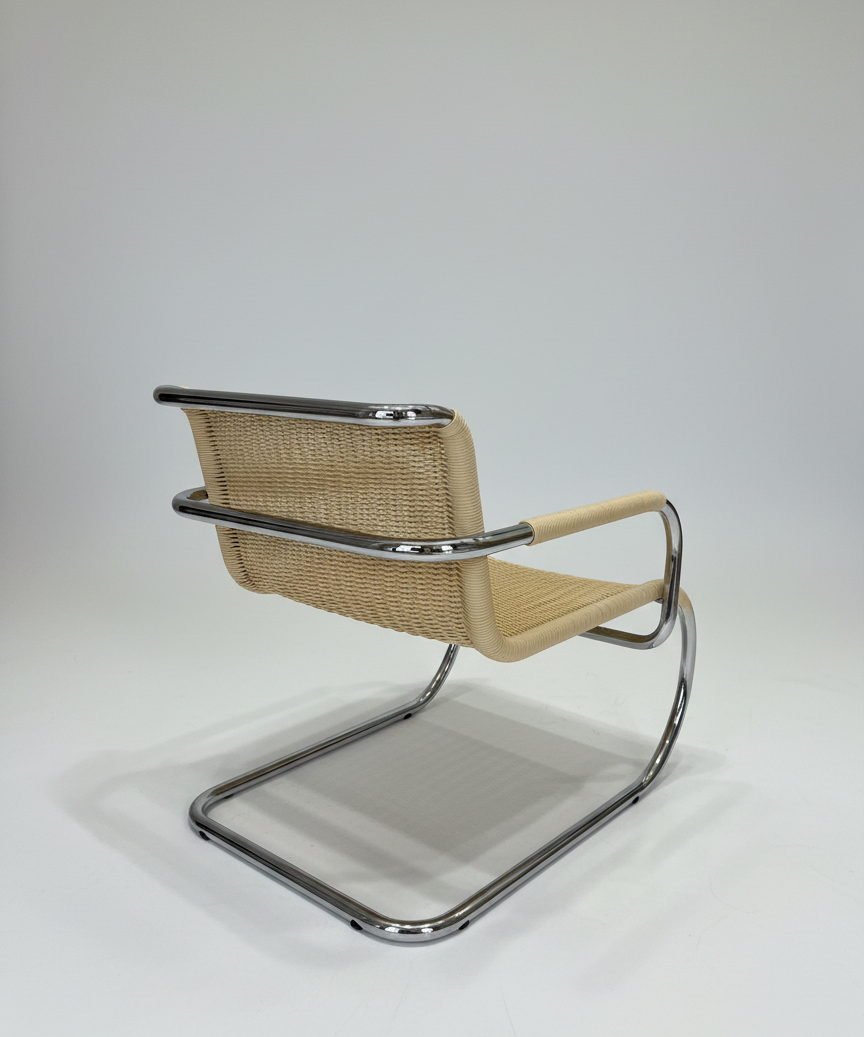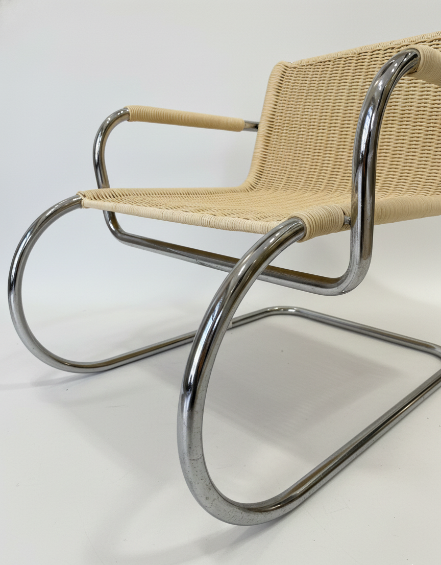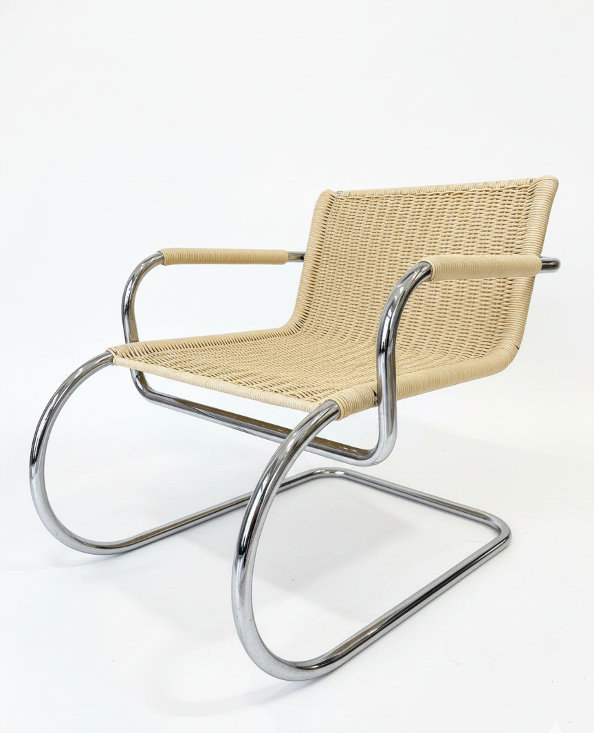 Estructura tubular de acero cromado y asiento de ratán, un icono atemporal del Racionalismo Italiano.
