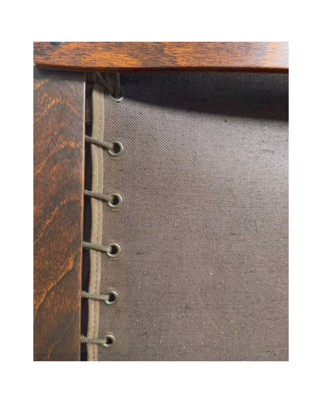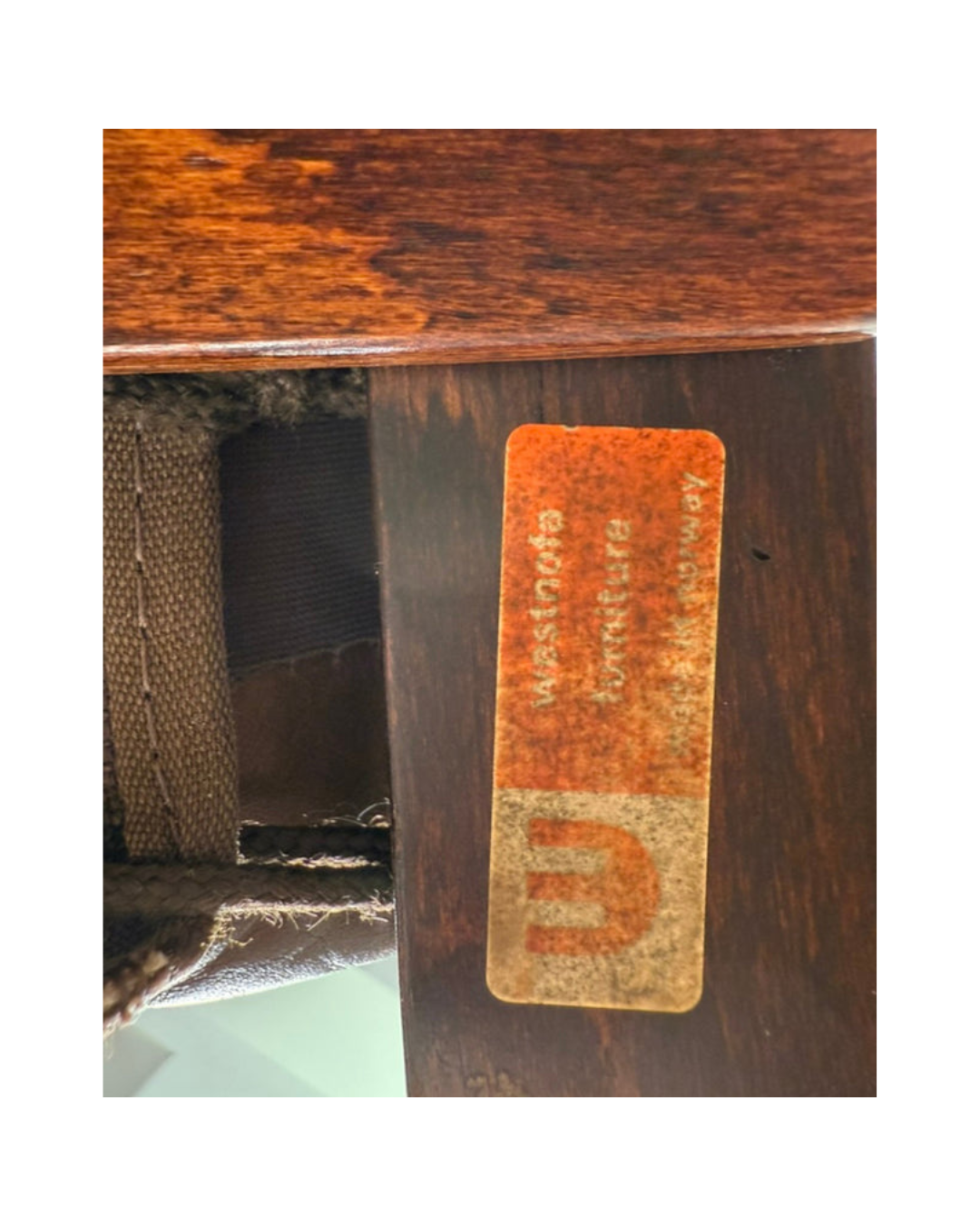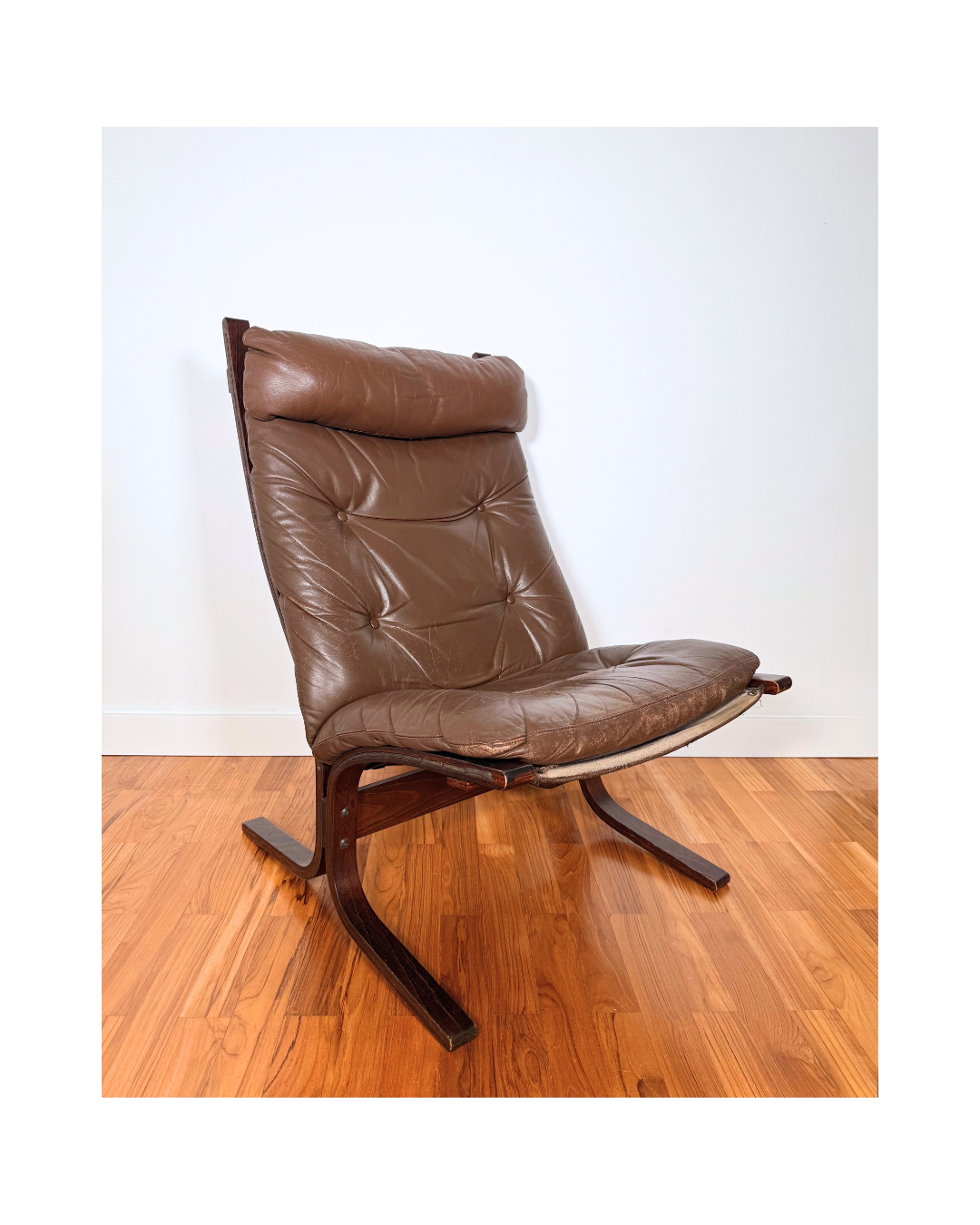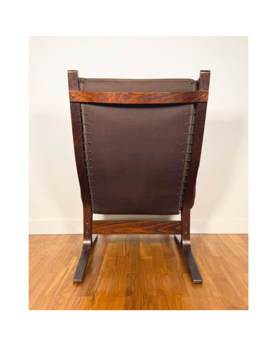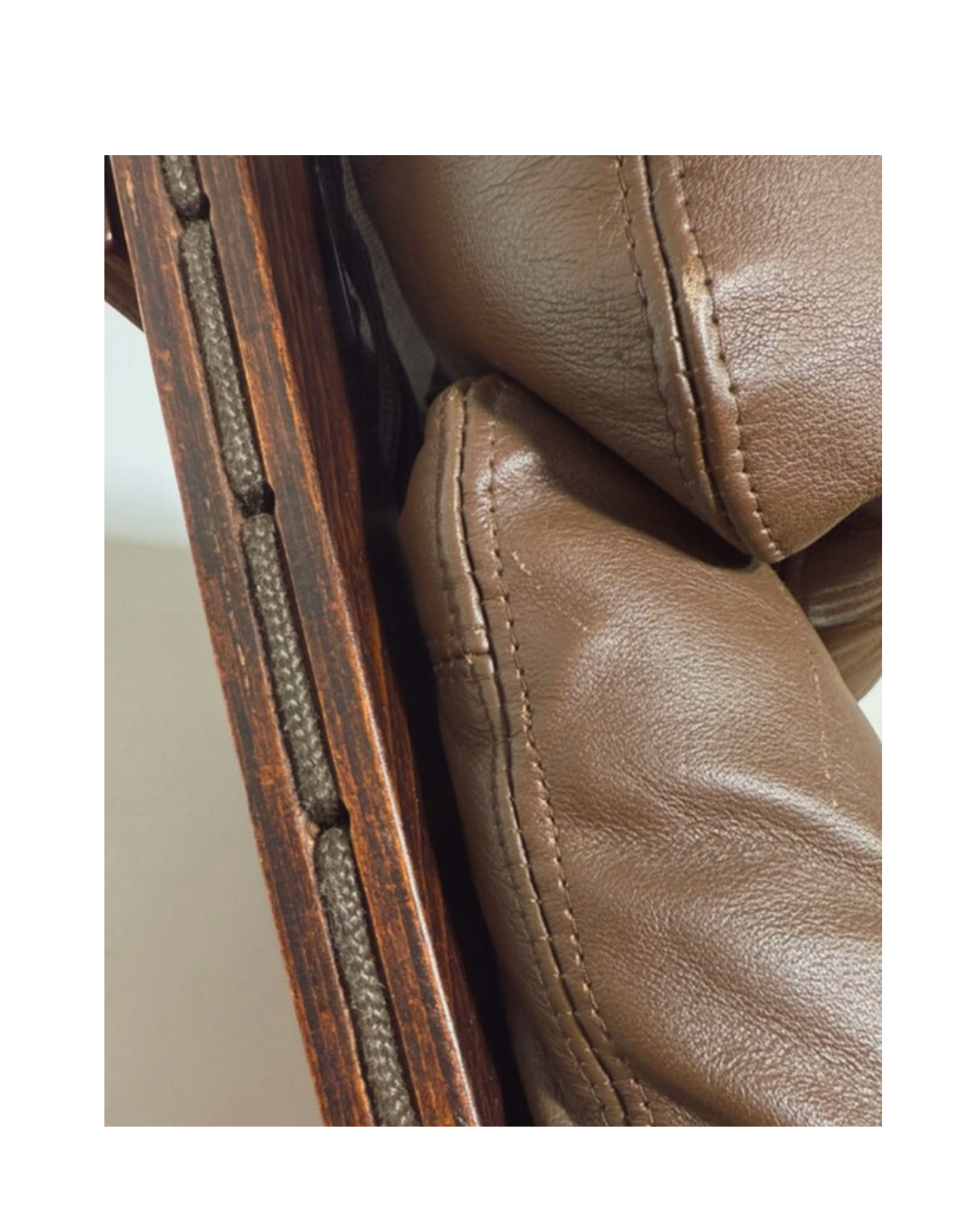 Butaca original Ingmar Relling con base de madera curvada en abedul, cojín desenfundable en piel, almohada para la nuca, respaldo en lona marrón, detalles trenzados en la parte inferior.