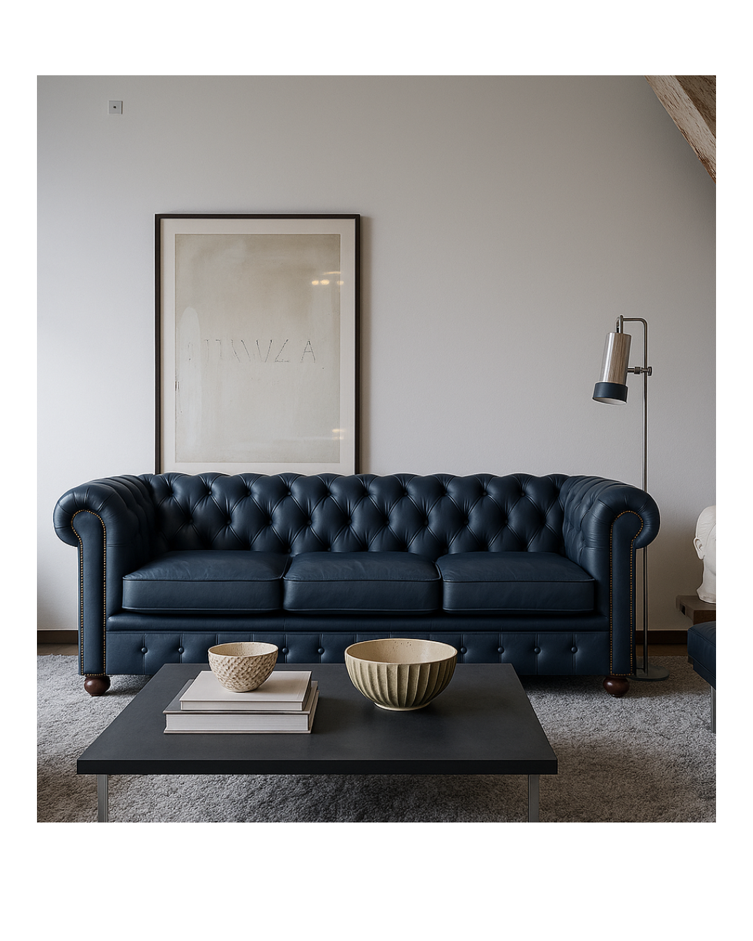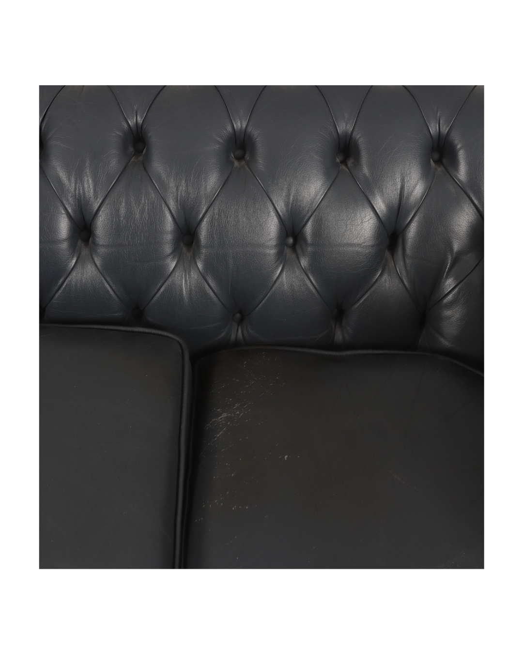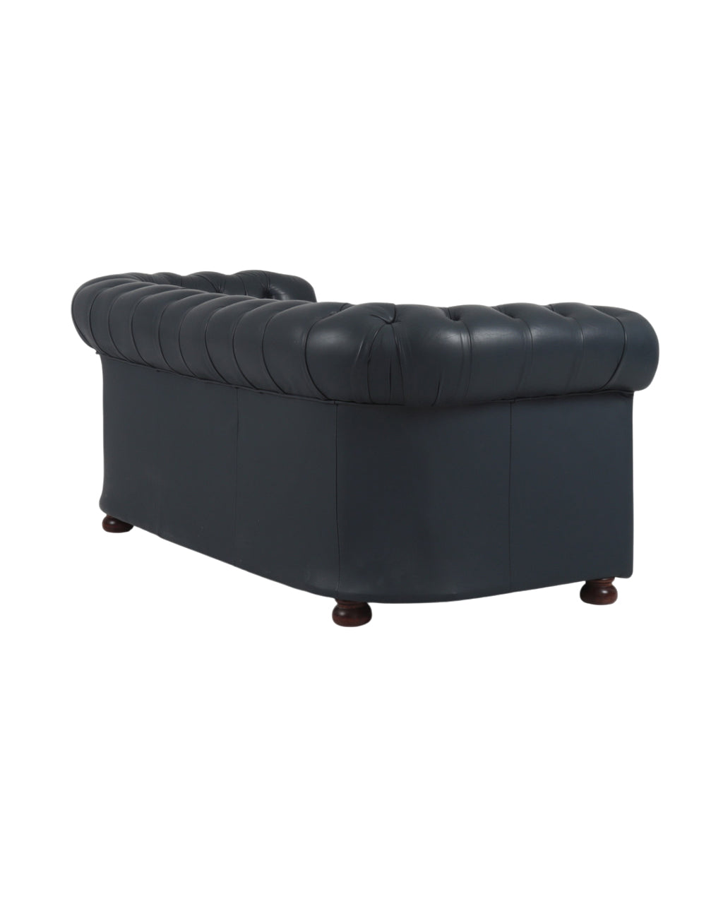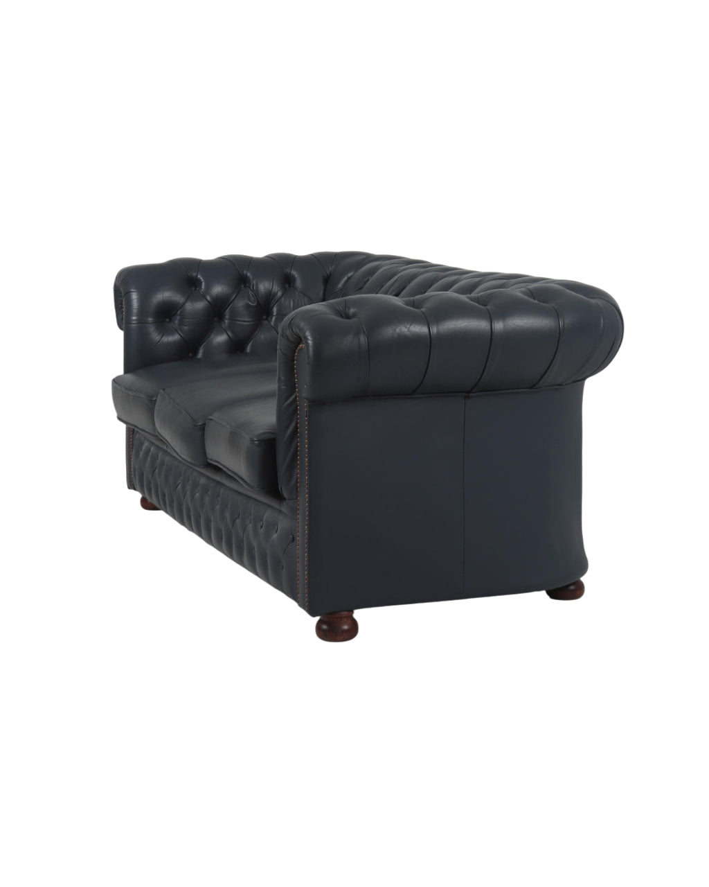 Elegante sofá de tres plazas Chesterfield de la marca Winchester. El diseño clásico y atemporal, hecho en piel azul marino con brazos enrollados y detalles de tachuelas. Luce cojines de respaldo de capitoné acolchados.